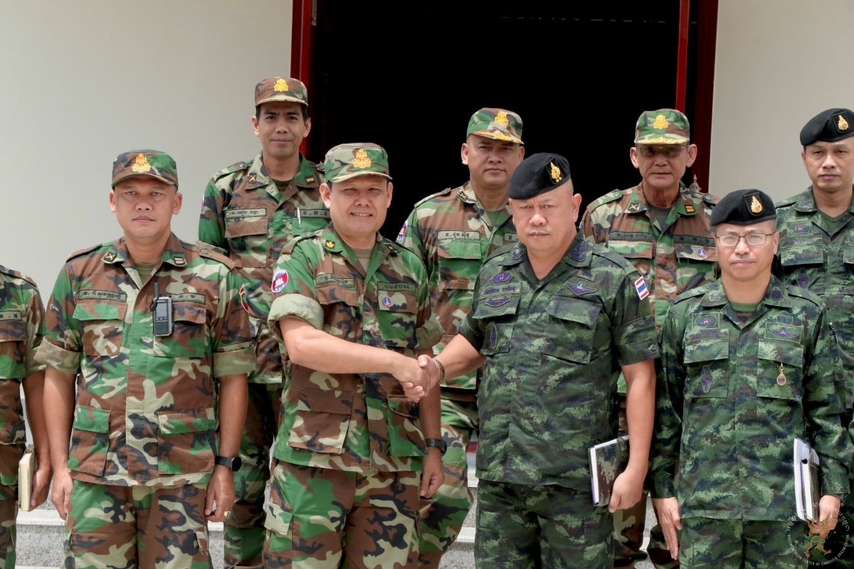 រូបថត ៖ ក្រុមលេខាធិការនៃគណៈកម្មាធិការព្រំដែនថ្នាក់យោធភូមិភាគកម្ពុជា ដឹកនាំដោយ ឧត្តមសេនីយ៍ត្រី និត ណារ៉ុង នាយសេនាធិការរង យោធភូមិភាគទី៤ និងក្រុមលេខាធិការនៃគណៈកម្មាធិការព្រំដែនថ្នាក់យោធភូមិភាគរបស់ថៃ ដឹកនាំដោយ ឧត្តមសេនីយ៍ត្រី កាំផាក់ណាក វ៉ាផាន់ស៊ុ នាយសេនាធិការ យោធភូមិភាគទី២ បានជួបប្រជុំគ្នានៅសាលប្រជុំក្រុមទំនាក់ទំនងកម្ពុជា-ថៃ ច្រកអន្តរជាតិអូរស្មាច់ ខេត្តឧត្តរមានជ័យ នៅព្រឹកថ្ងៃទី៣ ខែតុលា ឆ្នាំ២០២៥។ (ក្រសួងការពារជាតិកម្ពុជា)