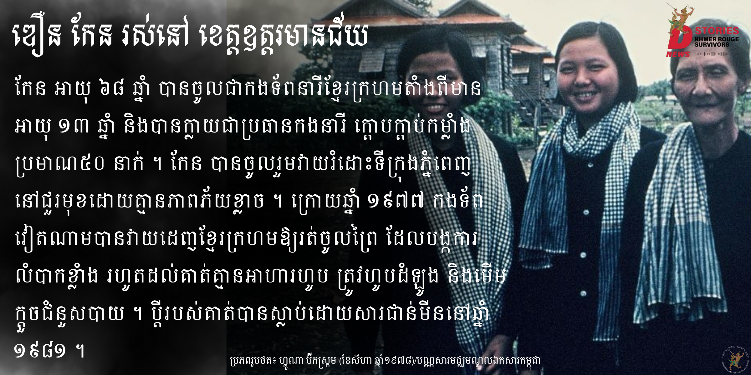 ឌឿន កែន[1] ភេទស្រី អាយុ៦៨ឆ្នាំ មានទីកន្លែងនៅក្នុងភូមិច្រាប ឃុំស្នួល ស្រុកស្នួល ខេត្តក្រចេះ។ កែន បច្ចុប្បន្នរស់នៅក្នុងភូមិស្រឡៅស្រោង ឃុំលំទង ស្រុកអន្លង់វែង ខេត្តឧត្តរមានជ័យ។ កែន បាននិយាយរៀបរាប់ពីដំណើរជីវិតនៃការតស៊ូរបស់ខ្លួននៅជំនាន់ខ្មែរក្រហមដូចតទៅ «កាលពីកុមារភាពខ្ញុំកើតនៅក្នុងគ្រួសារកសិករ ឪពុកម្ដាយខ្ញុំពុំមានឋានៈស័ក្តិយសអ្វីឡើយ។ ក្នុងវ័យ១៣ឆ្នាំ ខ្ញុំបានសម្រេចចិត្តចូលធ្វើជាកងទ័ពនារី។ បន្ទាប់ពីចូលជាកងទ័ព ខ្ញុំក៏បានចូលរួមក្នុងការហ្វឹកហាត់ពីយុទ្ធសាស្ត្រធ្វើសង្គ្រាមជាមួយកងទ័ពដទៃទៀត។ កាលណោះ ខ្ញុំប្រើពេលហាត់រៀនអស់រយៈពេល៦ខែទើប ខ្ញុំបានចេញទៅវាយនៅសមរភូមិជាមួយទ័ពនារីជាច្រើននាក់។ កំឡុងពេលនោះ ខ្ញុំមាននាទីជាប្រធានកងនារីក្ដោបក្ដាប់កម្លាំងទ័ពនារីចំនួន៥០នាក់។