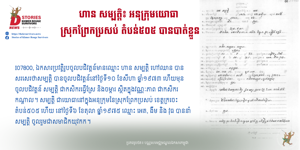 [2] I07800, ឯកសារប្រវត្តិរូបចូលបដិវត្ដន៍មានឈ្មោះ ហាន សម្បត្ដិ ហៅឈាន បានសរសេរថាសម្បត្តិ បានចូលបដិវត្តន៍នៅថ្ងៃទី១០ ខែសីហា ឆ្នាំ១៩៧៣ ហើយមុនចូលបដិវត្តន៍ សម្បត្តិ ជាកសិករធ្វើស្រែ និងចម្ការ ស្ថិតក្នុងវណ្ណៈភាព ជាកសិករកណ្តាល។ សម្បត្តិ ជាយោធានៅក្នុងអនុក្រុមនៃស្រុកព្រែកប្រសប់ ខេត្តក្រចេះ តំបន់៥០៥ ហើយ នៅថ្ងៃទី៦ ខែតុលា ឆ្នាំ១៩៧៥ ឈ្មោះ អេត, ងីម និង វុធ បាននាំសម្បត្តិ ចូលរួមជាសមាជិកយុវកក។