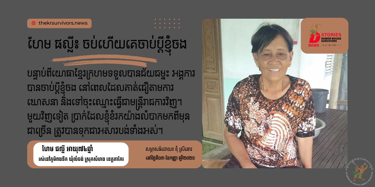 បន្ទាប់ពីយោធាខ្មែរក្រហមទទួលបានជ័យជម្នះ អង្គការបានចាប់ប្ដីខ្ញុំចង នៅពេលដែលគាត់ជឿតាមការឃោសនាទៅចុះឈ្មោះធ្វើជាមន្ត្រីរាជការវិញ។ មួយវិញទៀត ប្រាក់ដែលខ្ញុំខំរកយ៉ាងលំបាកមកពីមុនជាច្រើន ត្រូវបានបោះបង់ចោលទាំងអស់។