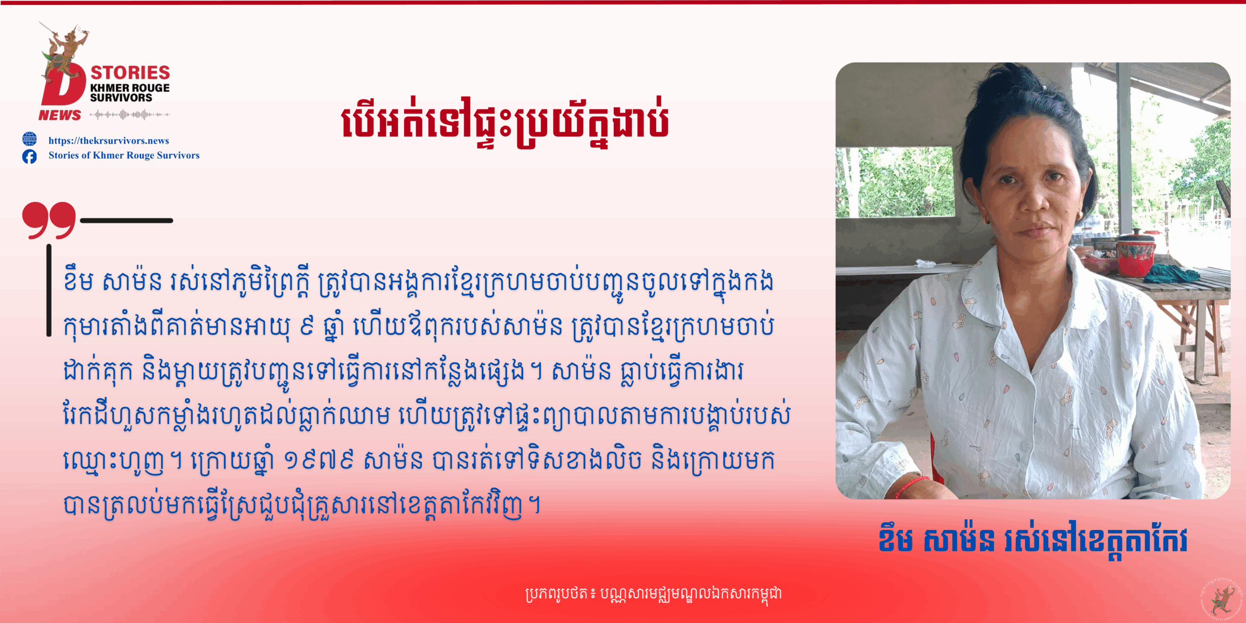 ខឹម សាម៉ន[1] អាយុ៥៥ឆ្នាំ រស់នៅភូមិព្រៃក្ដី ឃុំត្រពាំងធំខាងត្បូង ស្រុកត្រាំកក់ ខេត្តតាកែវ។ នៅក្នុងសម័យខ្មែរក្រហម ប្រជាជននៅក្នុងភូមិព្រៃក្ដី ធ្វើការថ្កោលទោស ឪពុករបស់សាម៉ន រួចចាប់គាត់យកទៅដាក់គុក។ នៅក្នុងគុក ឪពុករបស់សាម៉ន ត្រូវធ្វើការងាររែកដីធ្ងន់ៗហួសកម្លាំង និងហូបមិនគ្រប់គ្រាន់។ បន្ទាប់ពីចាប់ឪពុកទៅ អង្គការបានមកធ្វើបាបប្រពន្ធ និងកូនៗបន្តទៀត ដោយបញ្ជូនម្ដាយរបស់សាម៉ន ទៅធ្វើការងារនៅត្រពាំងកោះ ហើយបងប្រុសឈ្មោះរឹម ត្រូវទៅធ្វើការងារនៅក្នុងរោងចក្រ និងបាត់ដំណឹងរហូតមក។