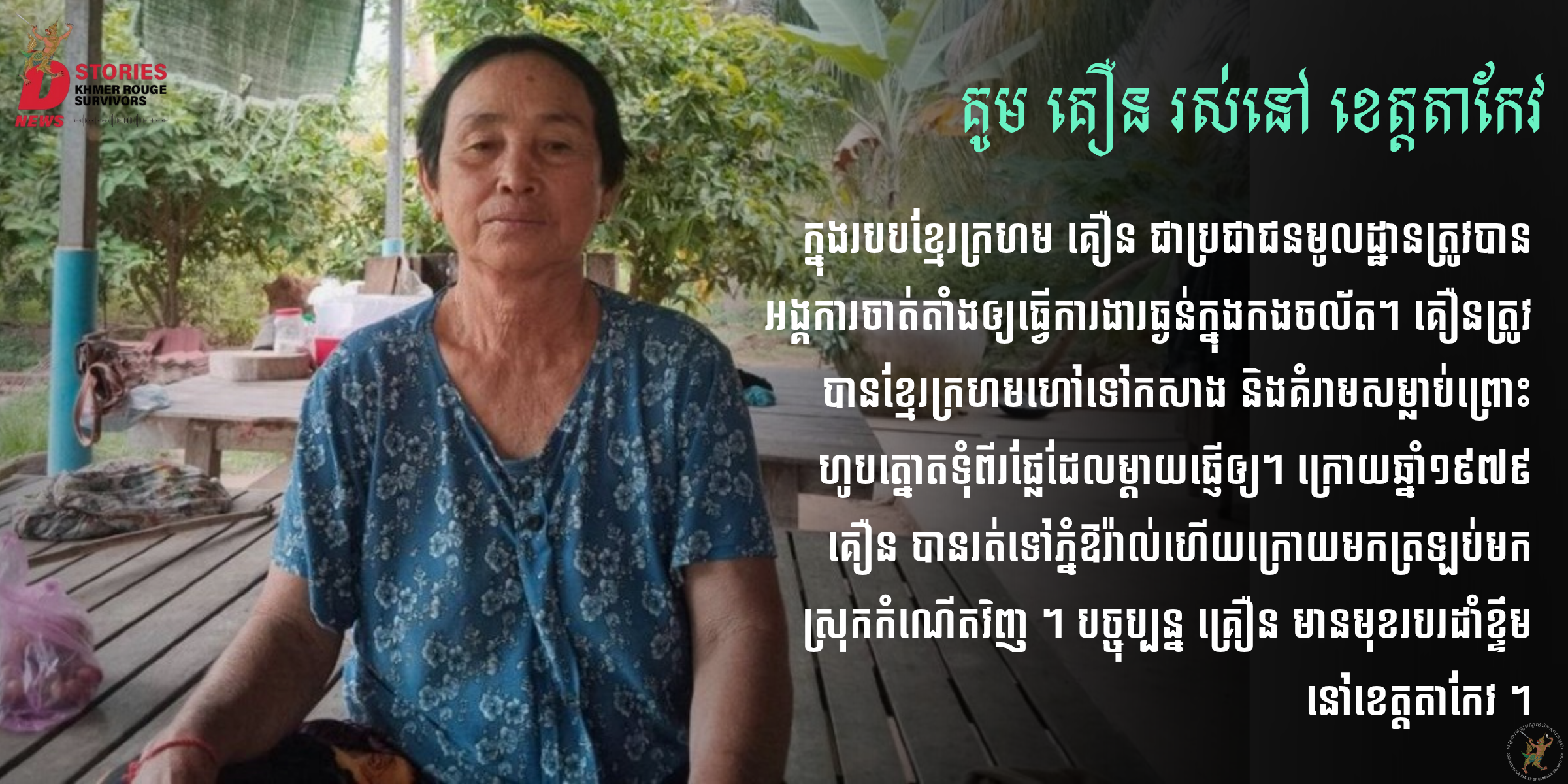 [1] បទសម្ភាសន៍ ជាមួយឈ្មោះ គូម គឿន អាយុ៦៩ឆ្នាំ រស់នៅភូមិត្រពាំងខ្លូត ឃុំត្រាំកក់ ស្រុកត្រាំកក់ ខេត្តតាកែវ។ សម្ភាសដោយ៖ ជីម សុខគា នៅថ្ងៃទី១៣ ខែកញ្ញា ឆ្នាំ២០២៥។