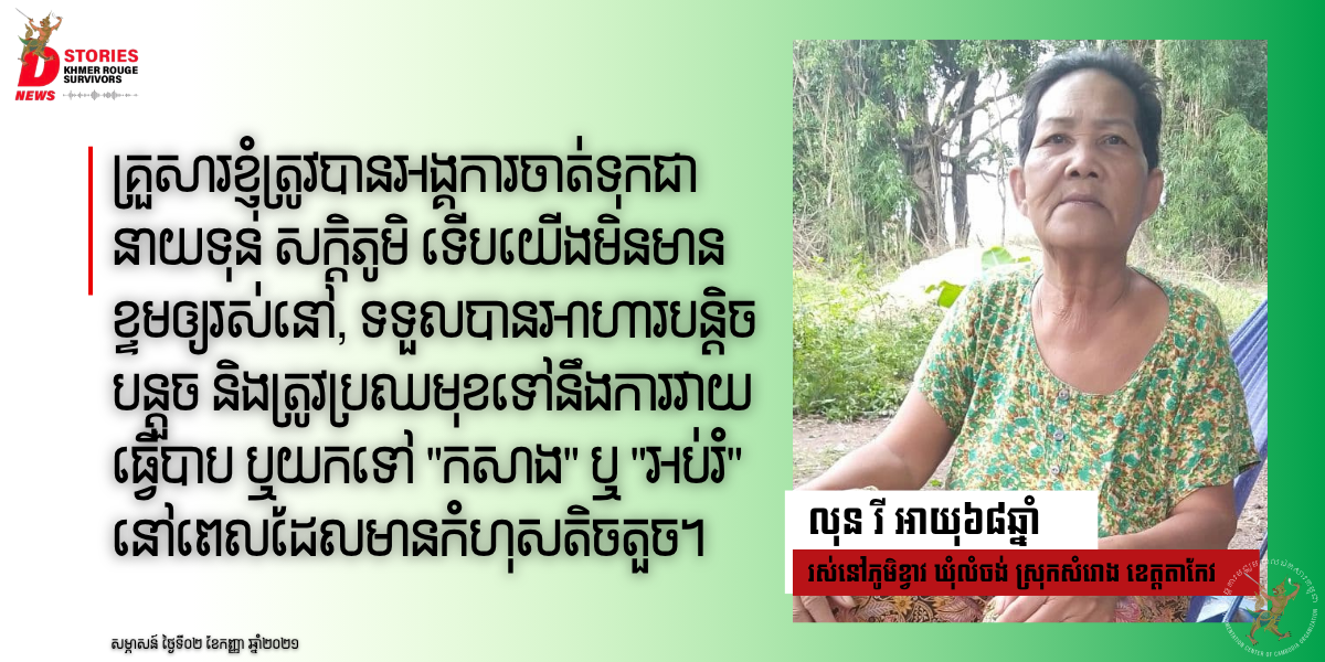 [1] ជួបជាមួយឈ្មោះ លុន រី នៅថ្ងៃទី០៦ ខែកញ្ញា ឆ្នាំ២០២១, សម្ភាសន៍ដោយខុំ ស្រីនោរ, ក្នុងគម្រោងការលើកកម្ពស់សិទ្ធិ និងធ្វើឲ្យប្រសើរឡើងនូវស្ថានភាពសុខភាពអ្នករស់រានមានជីវិតពីរបបខ្មែរក្រហម។