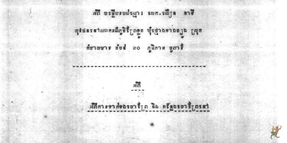 [1] ឯកសារលេខ D59655 ចម្លើយសារភាព (ឃុំថ្មោងខាងត្បូង ស្រុកកំចាយមារ តំបន់២០) ដោយបណ្ណសារមជ្ឈមណ្ឌលឯកសារកម្ពុជា ទំព័រទី១។