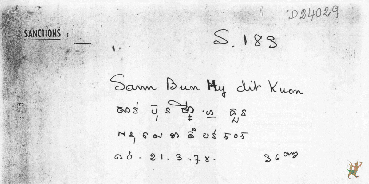 [11] ឯកសារលេខ J00768, តម្កល់នៅបណ្ណសារមជ្ឈមណ្ឌលឯកសារកម្ពុជា, “កង ឈ្មោះដើម បាន សារឿន អាយុ៣៣ឆ្នាំ(១៩៧៨)។ នៅក្នុងរបបខ្មែរក្រហម សារឿន មានតួនាទីជា អនុលេខាតំបន់ ៥០៥ (ក្រចេះ)។ កង ត្រូវបានអង្គការចាប់យកទៅឃុំខ្លួនទៅមន្ទីរសន្តិសុខស-២១ នៅថ្ងៃទី២២ ខែមេសា ឆ្នាំ១៩៧៧។”