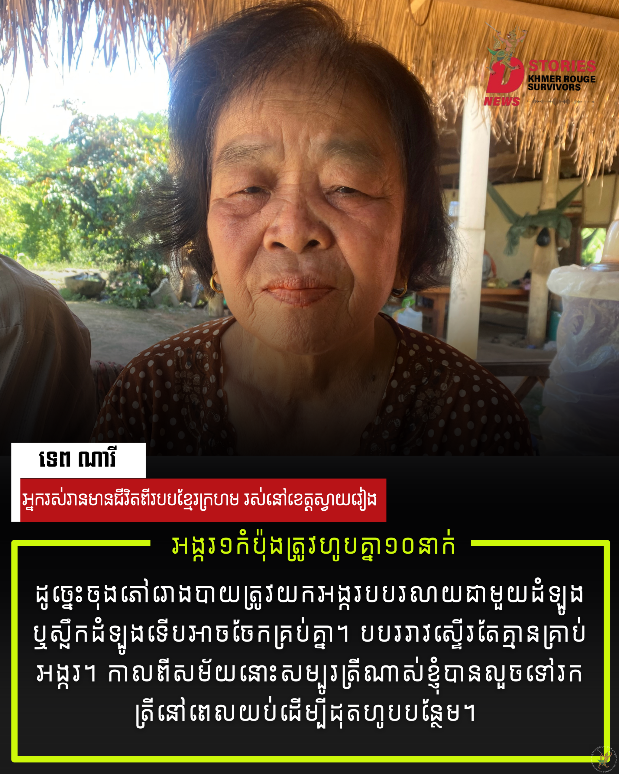 បន្ទាប់មកអង្គការបានផ្លាស់ប្តូរការងារ ណារី ពីកន្លែងធ្វើជីទៅខាងដេរសម្លៀកបំពាក់វិញ។ នៅក្រុមដេរចែកចេញជាពីរក្រុមគឺក្រុមដេរ និងក្រុមកាត់។ ណារី ស្ថិតក្នុងក្រុមដេរត្រូវដេរឲ្យបានចំនួន១០កំផ្លេក្នុងមួយថ្ងៃ។ ខោអាវដែលក្រុមណារី ដេរត្រូវបញ្ជូនទៅឲ្យកងងចល័ត។ ក្នុងមួយឆ្នាំខ្មែរក្រហមចែកខោវអាវ១កំផ្លេសម្រាប់មនុស្សម្នាក់។ ក្រោយពីការងារដេរសម្លៀកបំពាក់ ណារី អង្គការតម្រូវឲ្យត្បាញក្រណាត់។ ការងារនេះ ណារី មិនធ្លាប់ធ្វើពីមុនមកនោះទេ ប៉ុន្តែដោយសារខ្លាចត្រូវអង្គការដាក់ពិន័យ ណារី បានលួចមើល និងសួរអ្នកអ្នកធ្លាប់ធ្វើពីមុនៗរហូតអាចចេះ និងក្បាញក្រណាត់យ៉ាងស្ទាត់ជំនាញ។ ម្តាយរបស់ណារី តែងតែប្រាប់គាត់ថាឲ្យខិតខំធ្វើការងារឲ្យអង្គការព្រោះខ្លាចគេសម្លាប់។ ម្តាយ និងចាស់ក្នុងភូមិត្រូវមើលក្មេងៗនៅក្នុងកងកុមារ។ របបអាហារ ណារី និយាយថារបបអង្ករ១កំប៉ុងត្រូវហូបគ្នា១០នាក់ ដូចនេះអ្នកទទួលខុសត្រូវនៅរោងបាយត្រូវបបរ លាយជាមួយដំឡូង ឬស្លឹកដំឡូងទើបអាចចែកគ្រប់គ្នា បបររាវៗស្ទើរតែគ្មានគ្រប់អង្ករ។ កាលពីសម័យនោះសម្បូរត្រីណាស់នៅតាមវាលស្រែ ណារី បានលួចទៅរកត្រីនៅពេលយប់ដើម្បីដុតហូប។
