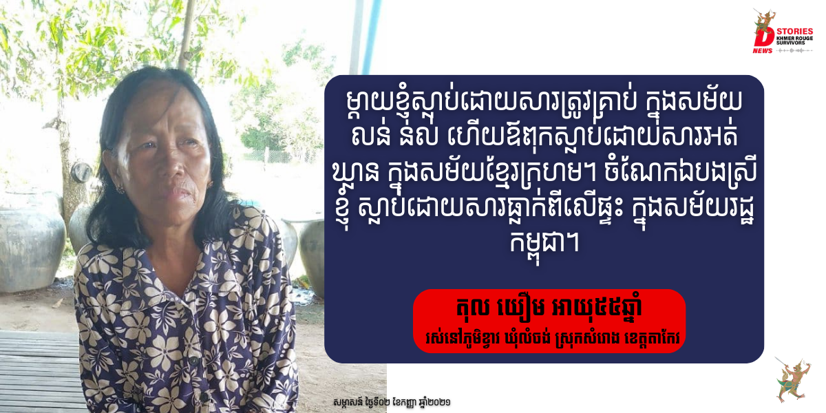 តុល យឿម ភេទស្រី អាយុ៥៥ឆ្នាំ រស់នៅភូមិខ្វាវ ឃុំលំចង់ ស្រុកសំរោង ខេត្តតាកែវ។ នៅក្នុងសម័យ លន់ នល់ ឪពុករបស់យឿម ធ្វើជាទាហាន។ ជាញឹកញាប់ ម្ដាយរបស់យឿម បាននាំកូន៣នាក់ ធ្វើដំណើរតាមឪពុក ដើម្បីគេចពីសង្គ្រាម។ ថ្ងៃមួយ នៅពេលដែលគ្រួសារយឿម ធ្វើដំណើរទៅដល់សៃវ៉ា ម្ដាយរបស់គាត់បានត្រូវគ្រាប់ស្លាប់ ទាំងមានកូនក្នុងផ្ទៃ។ បន្ទាប់ពីម្ដាយស្លាប់ ឪពុករបស់យឿម បានបន្តលើកគាត់ ​ឲ្យជិះក រួចធ្វើដំណើរទៅមុខទៀត។