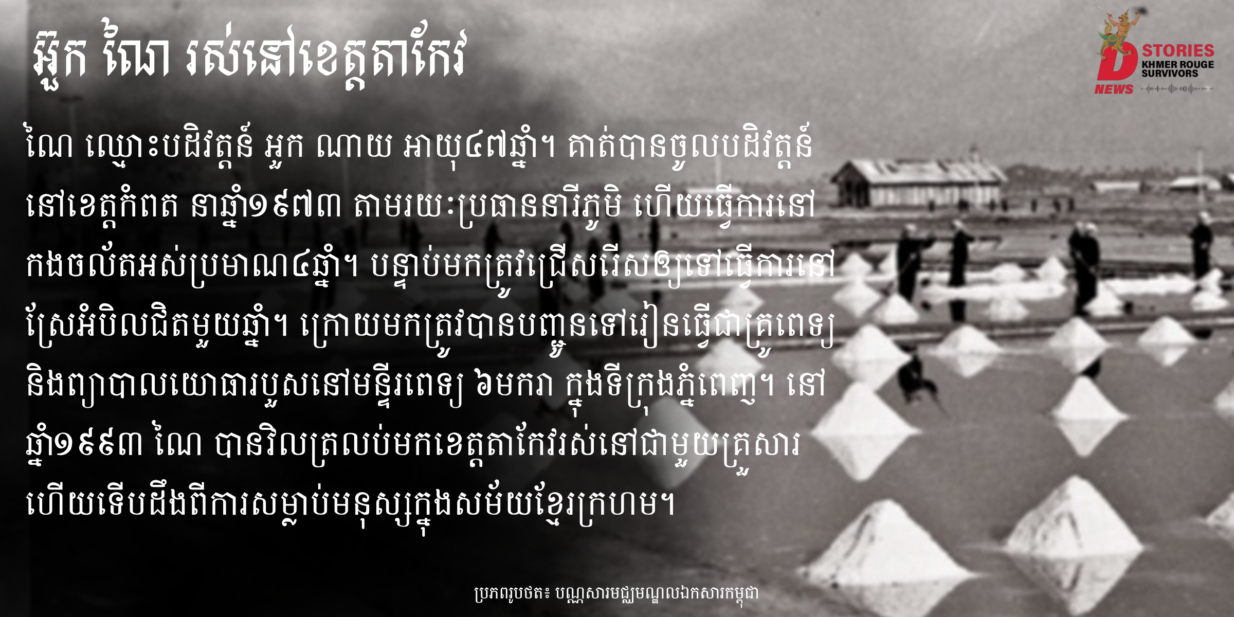 ណៃ ធ្វើការងារនៅក្នុងកងចល័តបានប្រមាណ៤ឆ្នាំ ទើបឈ្មោះ ឈាវ ណឹង ជាប្រធានក្រុមជ្រើសរើសគាត់ និងមិត្តរួមក្រុម១៤នាក់ទៀត ដើម្បីឲ្យទៅធ្វើការងារនៅស្រែអំបិល។ នៅស្រែអំបិល ក្រុមរបស់ ណៃ ដែលមានសមាជិកប្រមាណ១០០នាក់ ស្ថិតនៅក្នុងការគ្រប់គ្រងរបស់ប្រធានកងឈ្មោះ ជឿន។ នារីដែលធ្វើការងារនៅស្រែអំបិលទាំងអស់ មានអាយុប្រហាក់ប្រហែល ណៃ លើកលែងតែងមនុស្សចំណាស់ពីរនាក់ដែលមានអាយុប្រមាណ៥០ឆ្នាំ ធ្វើការងារជាអ្នកបច្ចេកទេសអំបិល, កាន់ម៉ាស៊ីន និងពិនិត្យកំហាប់ទឹក។ ណៃ បានឲ្យដឹងទៀតថា ការងារនៅស្រែអំបិលគឺធូរស្រាលជាកងចល័ត ហើយការហូបអាហារគ្រប់គ្រាន់។ នៅពេលដែលខិតជិតរដូវភ្លៀងធ្លាក់ ណៃ ត្រូវធ្វើការងារទាំងយប់ទាំងថ្ងៃ ប៉ុន្តែថ្ងៃណាមានភ្លៀងធ្លាក់មិនអាចកើបអំបិលបានគាត់អាចសម្រាកនៅផ្ទះ។